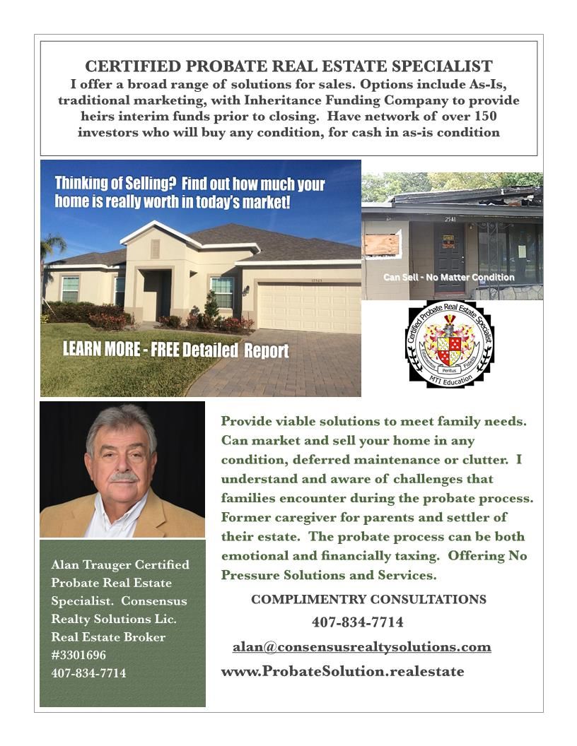 TO WHOM IT MAY CONCERN: It is with great pleasure and gratitude that i write this testimonal to attest to the suberb professional service provide by Alan Trauger of Consensus Realty Solutions, Inc. The undersigned is a Licensed Real Estate Broker, of 44 years experience, who practices in Miami - Dade and Broward Counties of Florida. I know the importance and difference that knowledge of the market and professional experience play in the successful completion of real estate transactions. i entrusted Alan with the marketing and sale of my property in Kissimmee, FL. Alan diligently worked on its marketing and provided and provided thorough and insigthful counseling and buyer profiles of prospective purchasers that had interest in the property. Alan's assistance was priceless. Alan is a Realtor's Real Estate Broker, and I enthusiastically recommend his services.